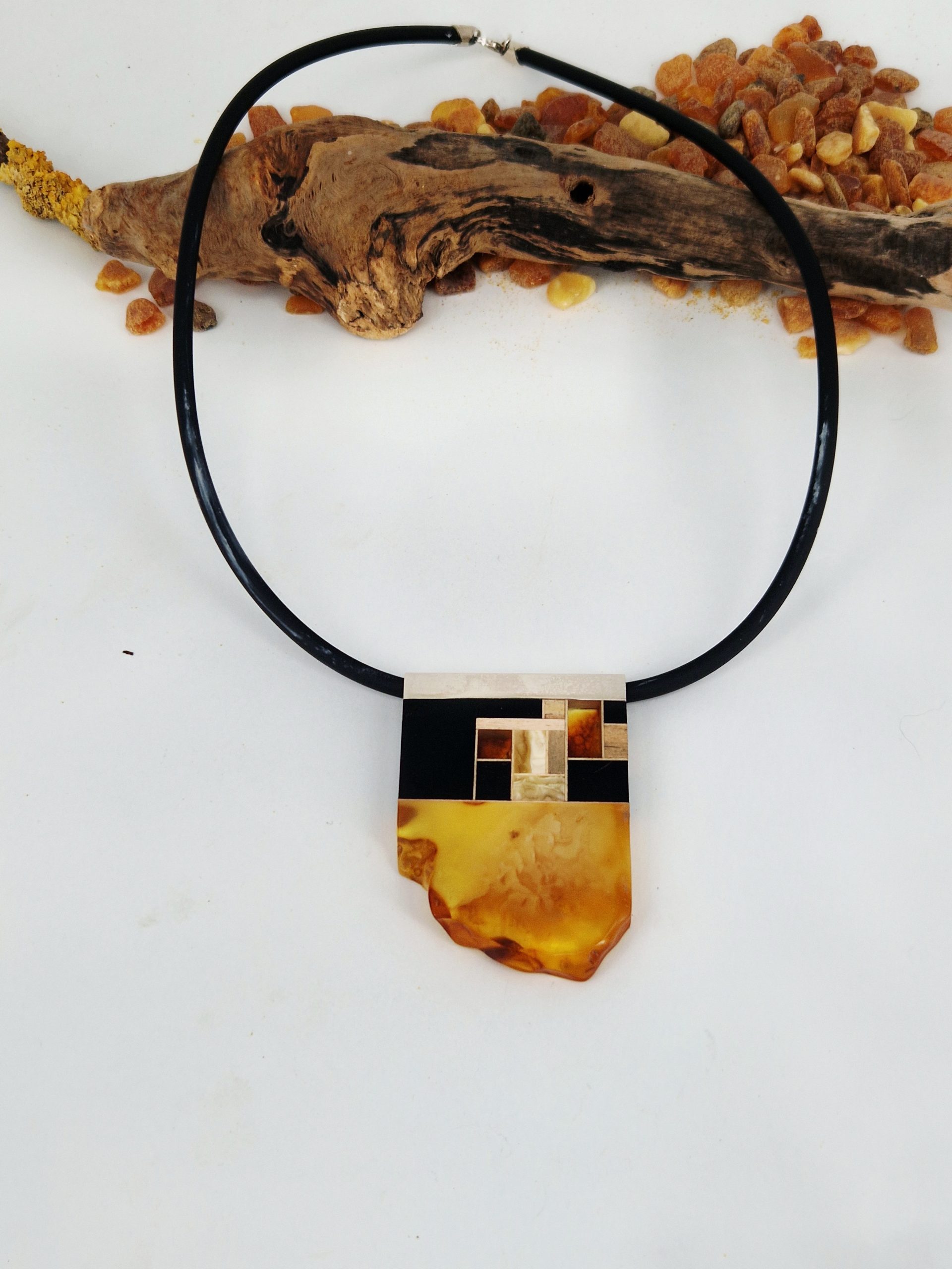 Dieser große Anhänger wurde mit Bernstein mit verschiedenen Holzarten zu einer einzigartigen Mosaik nach ArtDeco Inspiration zusammengestellt. Die Aufhängung aus Sterling-Silber rundet das das puristische Design dieses schönen Stückes ab. Das zugehörige Leinenband unterstreicht die Natürlichkeit dieses Colliers.