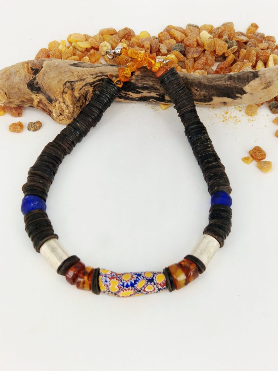 Archaisch wirkt dieses Collier mit einer hochwertigen, antiken venezianischen Millefiori-Perle aus Glas, versilberten Messingperlen, Bernstein, Kokosscheiben und blauen Recycling-Glasperlen aus Togo- die Lochung dieser Perlen entsteht durch Blätter, die zusammengerollt und durch die noch flüssige Glasmasse gesteckt werden –