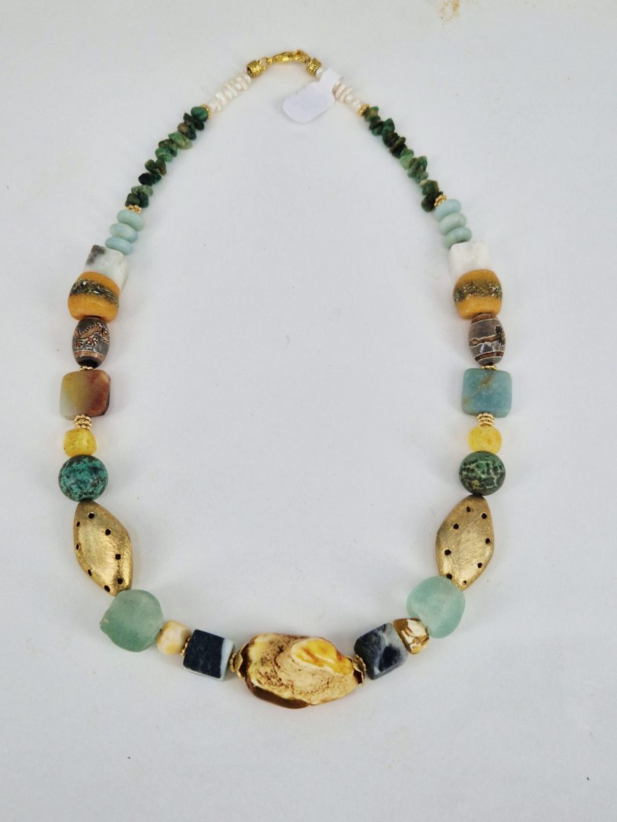 Unikat Collier mit Bernstein, blauem Andenopal und afrikanischen Perlen