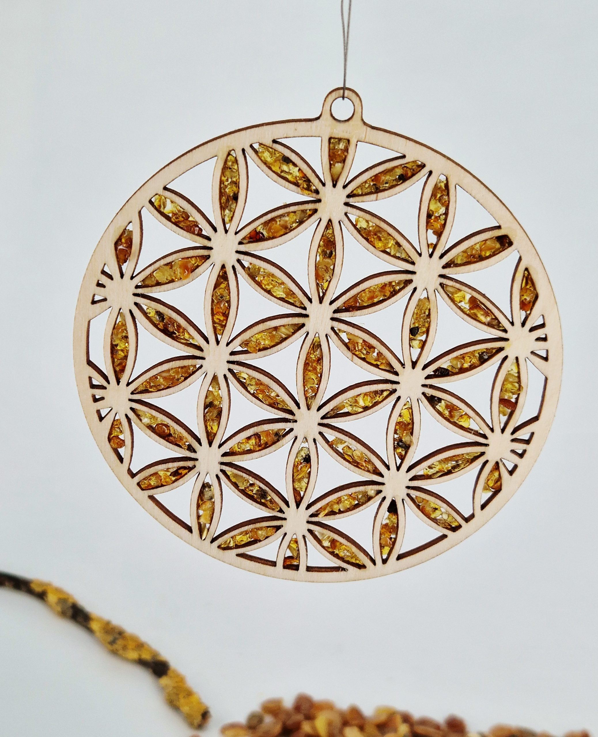 Fensterbild aus Birkenholz und Bernsteinsplittern, Durchmesser 11 cm
